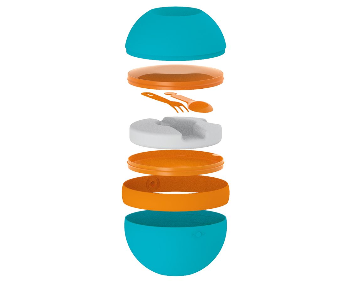 Он состоит из двух герметичных и вместительных чаш с крышкой, между которыми помещаются столовые приборы и охлаждающий элемент с отверстием для йогурта в центре. При желании пластиковые вилка и ложка соединяются в удобные щипцы для салата.