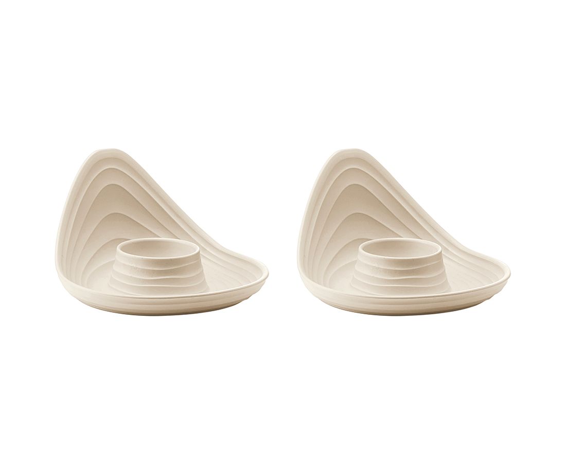 Подставки для яиц выполнены из переработанного пластика. Дизайн изделий напоминает керамику, а реалистичности внешнему виду придают тщательно подобранные пастельные тона и неровные круговые узоры, создающие эффект ручной работы.