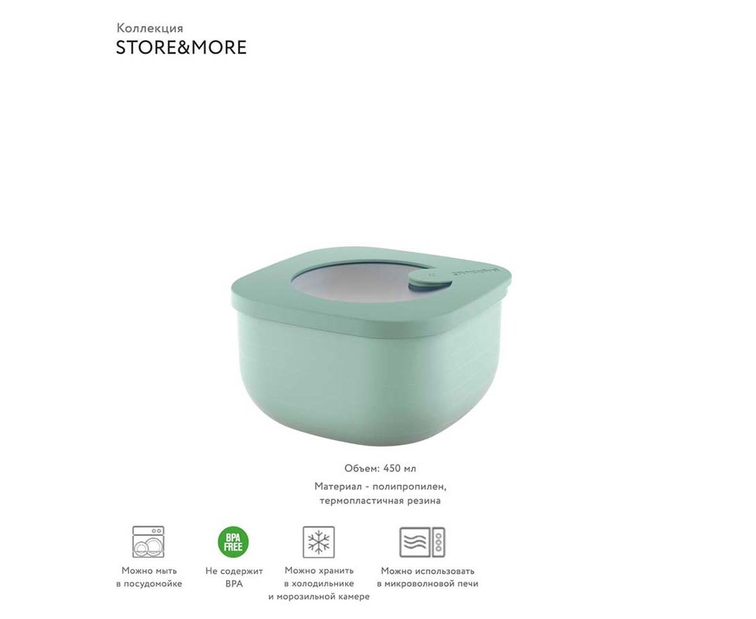 Пищевой контейнер Store&More объемом 450 мл идеально подходит для использования дома и на открытом воздухе. Посуда предназначена для хранения продуктов в холодильнике или морозильной камере, нагрева в микроволновой печи, транспортировки и подачи блюд. Изделие можно взять с собой на дачу, пикник или на работу. Идея создания пищевого контейнера в форме куба с плавными обтекаемыми углами принадлежит дизайнерской студии Spalvieri & Del Ciotto.