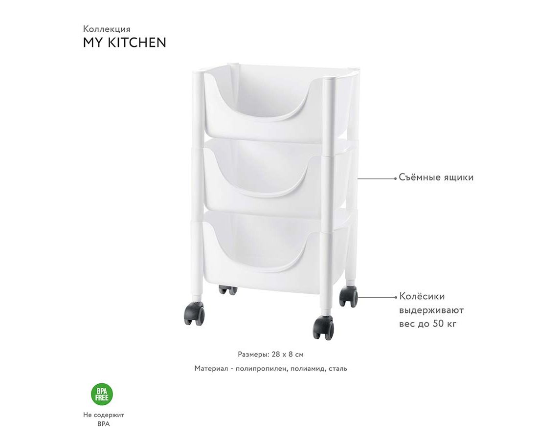 Универсальные полки для хранения всего, что может понадобиться вам в течение дня: начиная с овощей и фруктов и заканчивая крупами, хлебом и домашними заготовками. Вся конструкция представляет собой модульную систему, в которой верхний ярус вставляется в предыдущий, а к нижней полке крепятся четыре колеса.