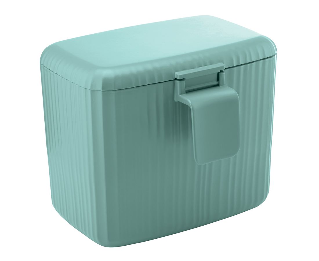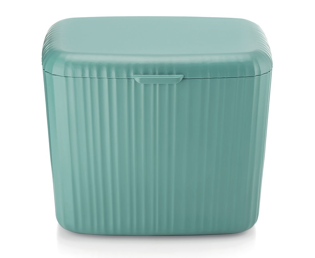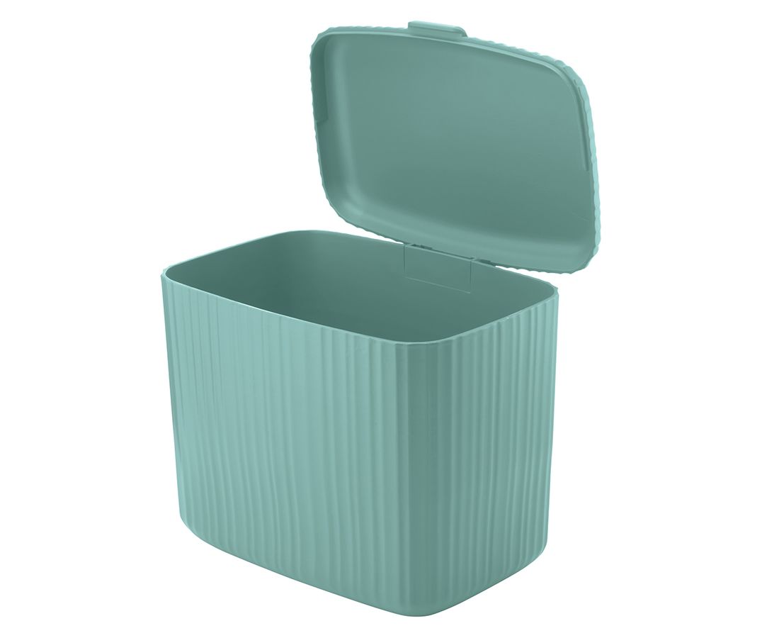 Изделие выполнено из переработанного пластика PET. Изделие покрыто специальным материалом с антибактериальными свойствами. Крышка открывается и закрывается одной рукой. Контейнер можно расположить на столешнице или повесить на дверцу кухонного шкафчика.