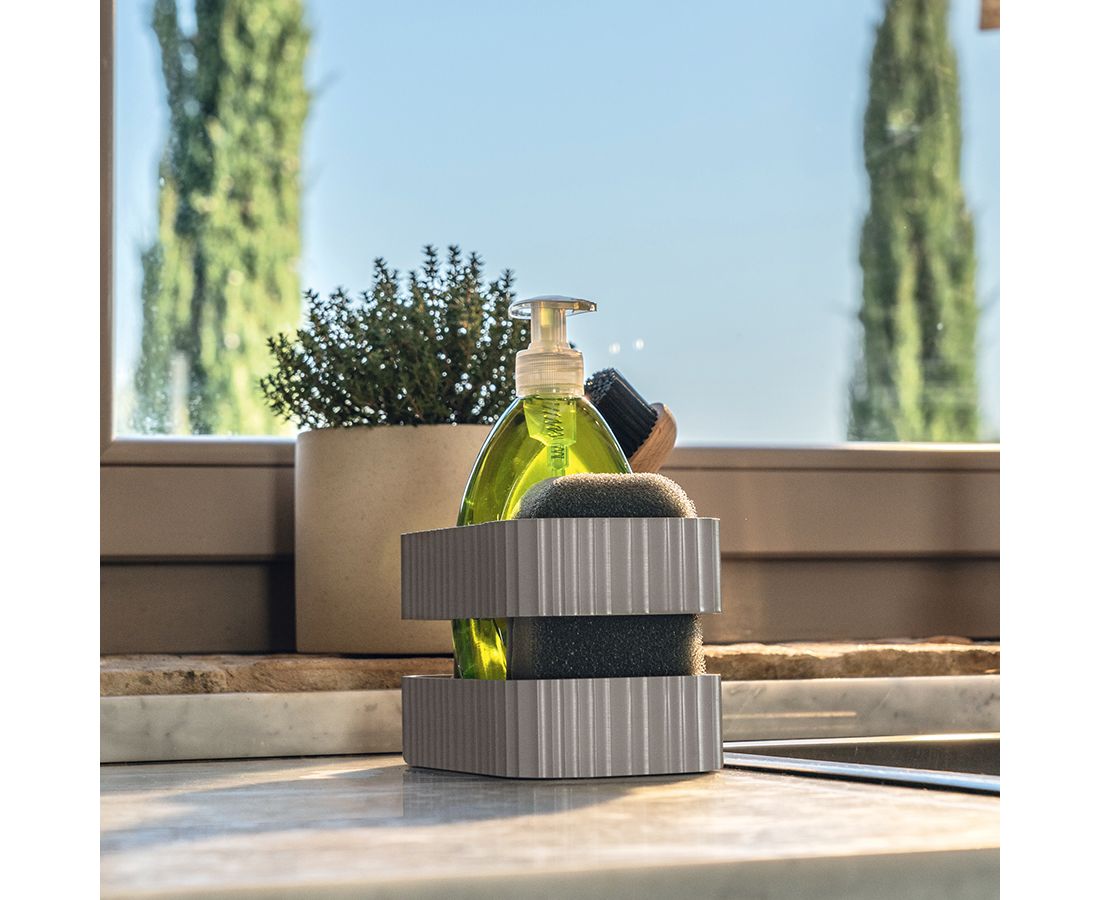 Сушилка включает 3 отделения разной глубины для лаконов с жидким мылом и моющим средством, щеток, губок. Изделие выполнено из переработанного пластика PET. Конструкция легко разбирается.