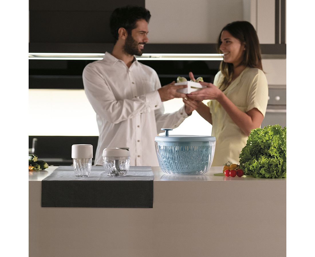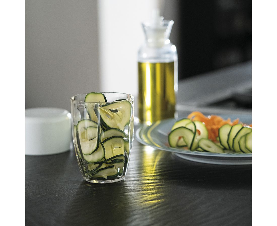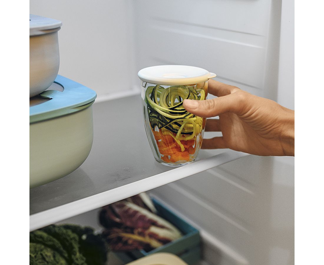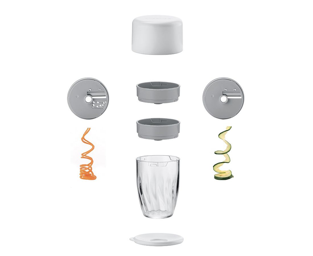 Терка легко разбирается на составные части и пригодна для мытья в посудомоечной машине. В комплект входит крышка, которая плотно прилегает к контейнеру. Благодаря этому красивые спиральки или спагетти из любимых овощей вы сможете хранить в холодильнике или брать с собой.