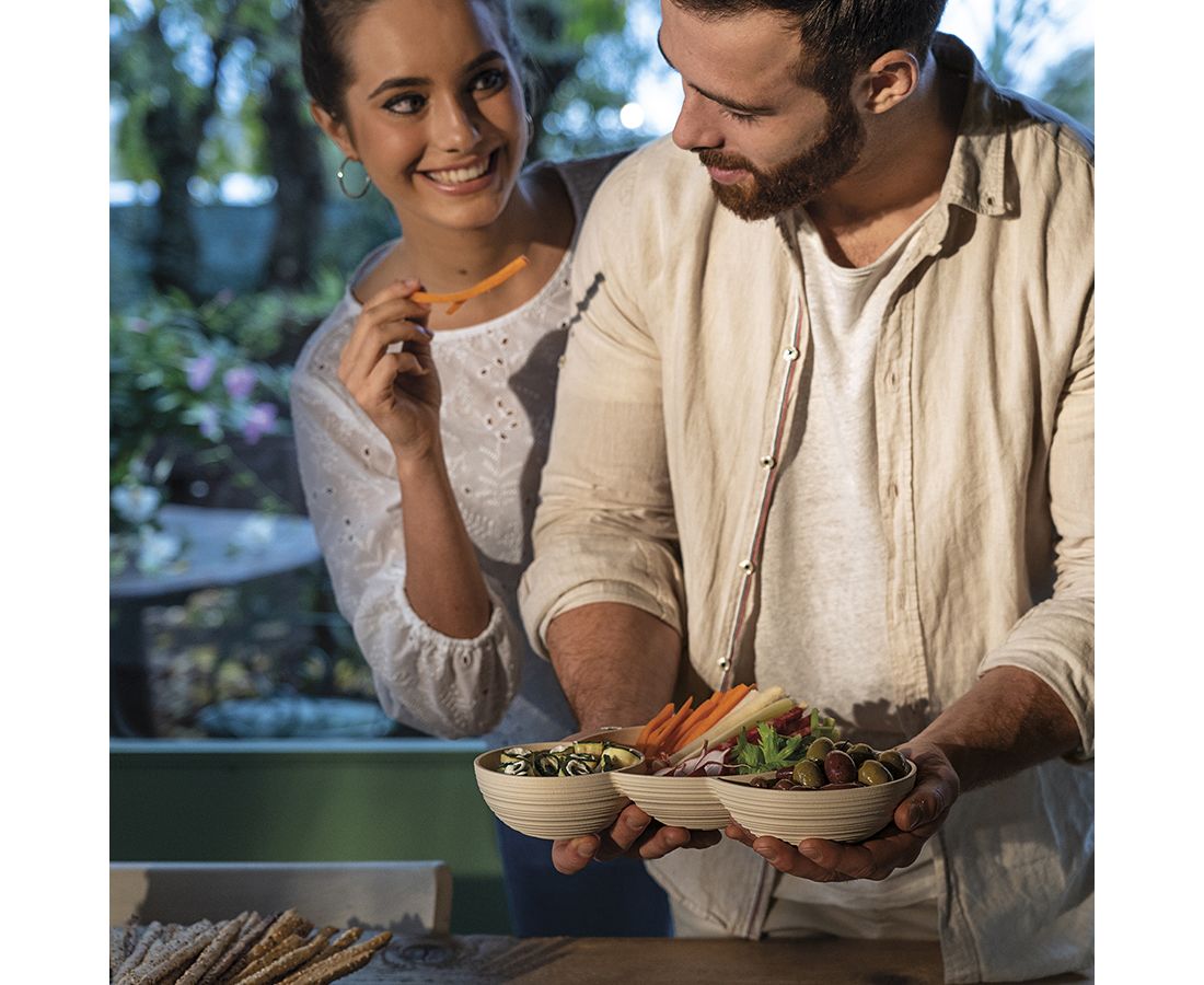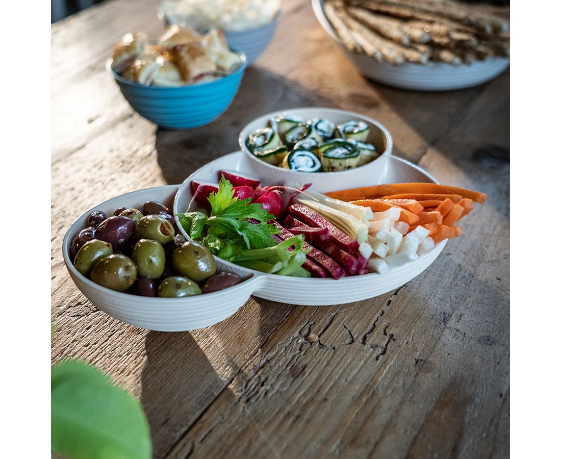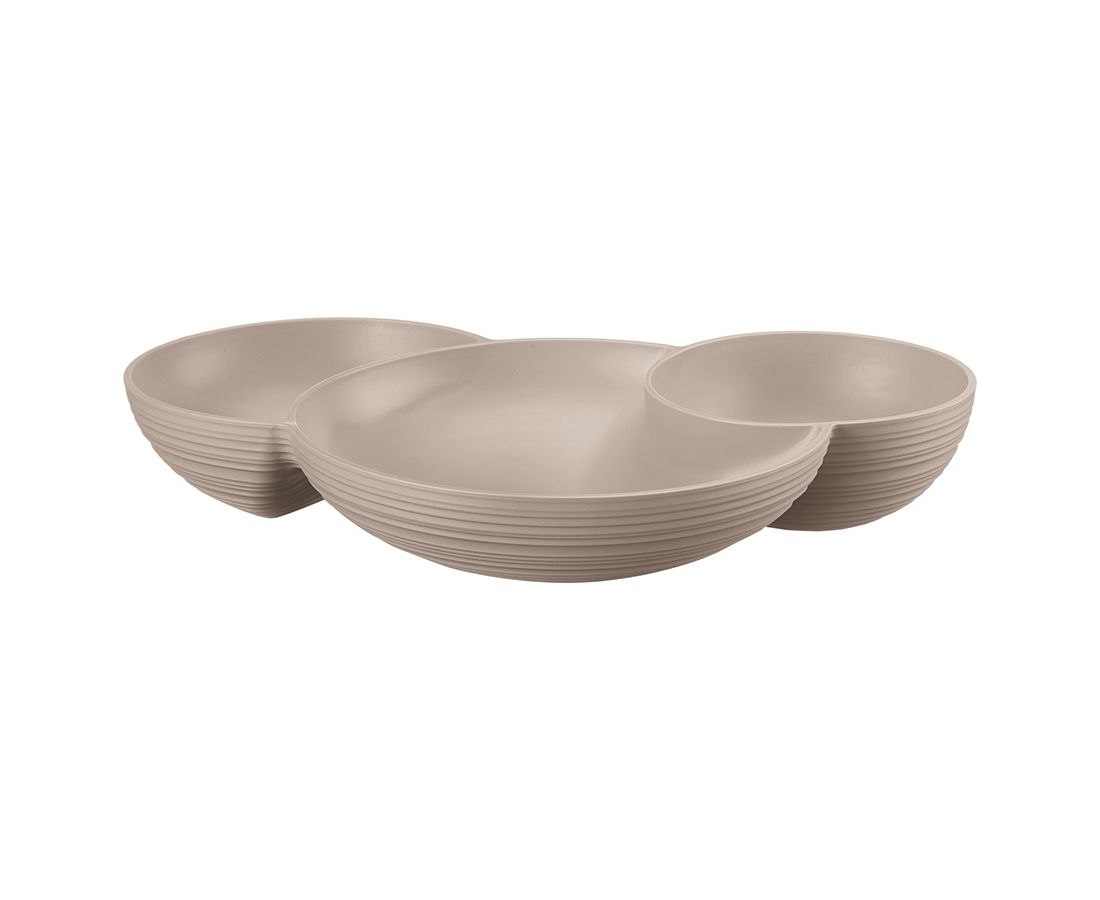 Тройная менажница из переработанного пластика с фактурой, имитирующей глину, подойдет для подачи закусок и снеков.
