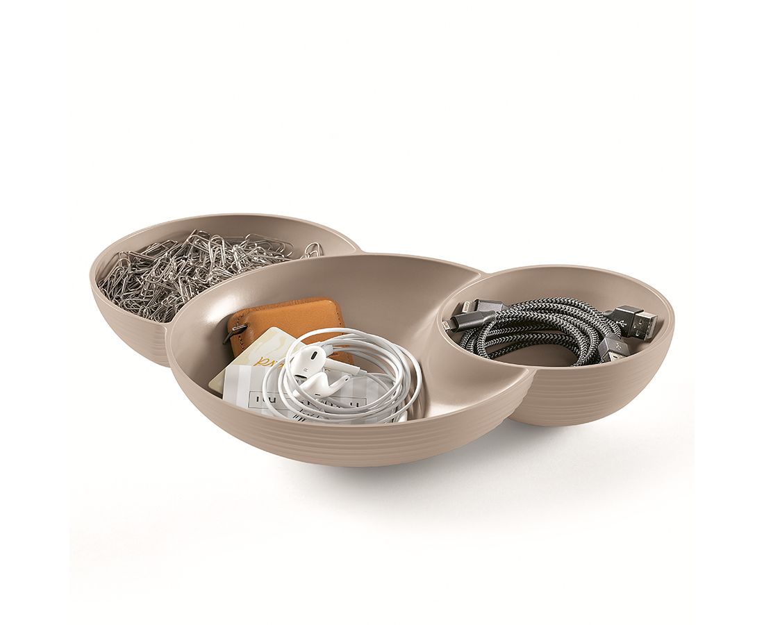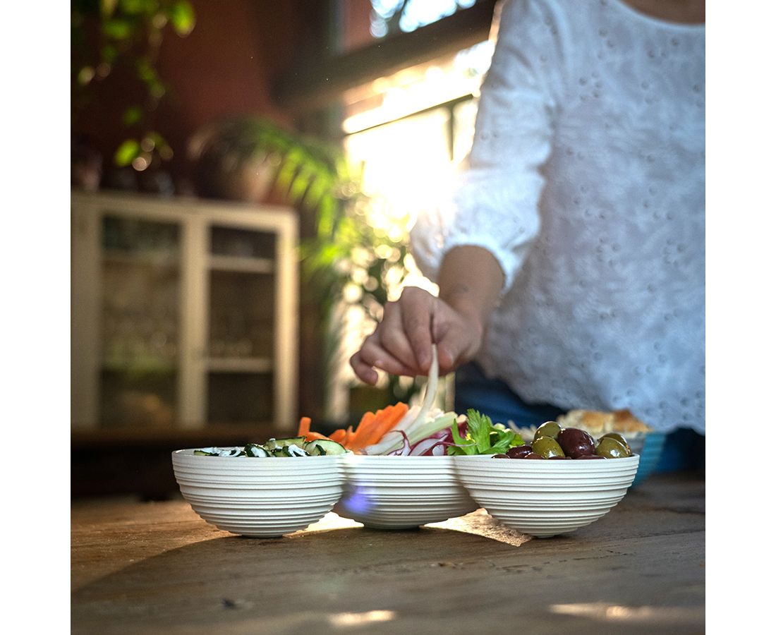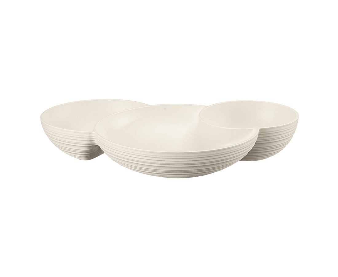Тройная менажница из переработанного пластика с фактурой, имитирующей глину, подойдет для подачи закусок и снеков.