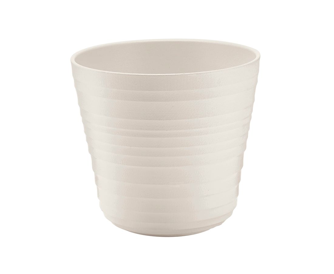 Кашпо для комнатных растений выполнено из переработанного пластика. Дизайн изделия напоминает керамику, а реалистичности внешнему виду придают тщательно подобранные пастельные тона и неровные круговые узоры, создающие эффект ручной работы.
