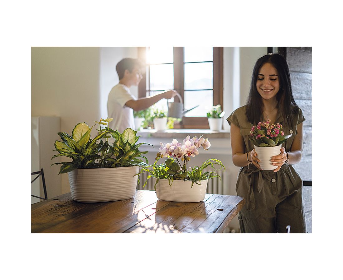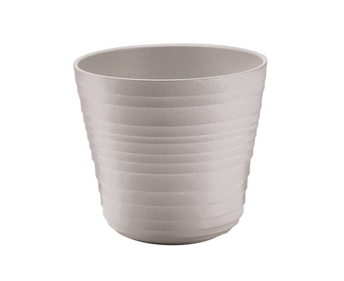 Кашпо для комнатных растений выполнено из переработанного пластика. Дизайн изделия напоминает керамику, а реалистичности внешнему виду придают тщательно подобранные пастельные тона и неровные круговые узоры, создающие эффект ручной работы.