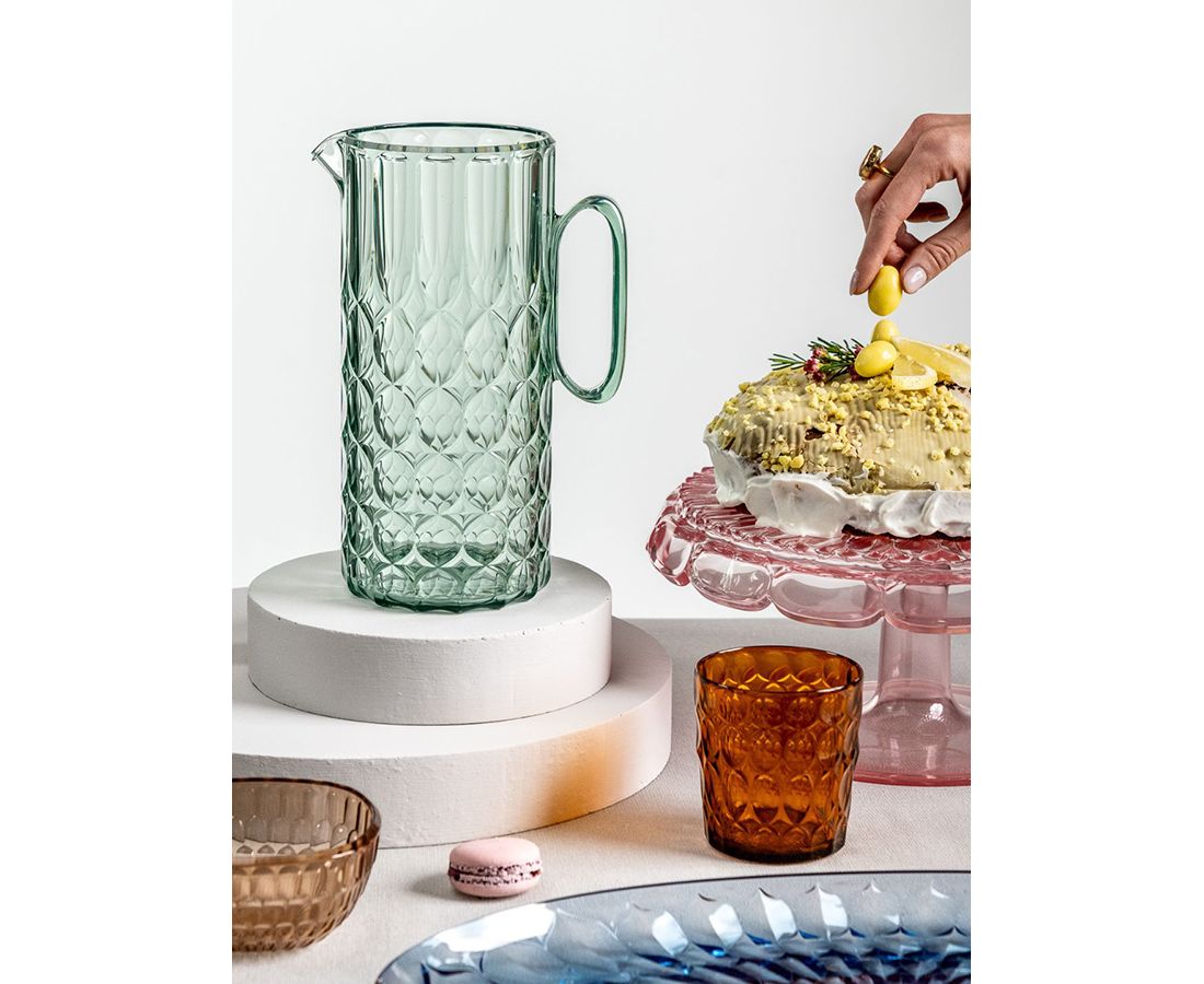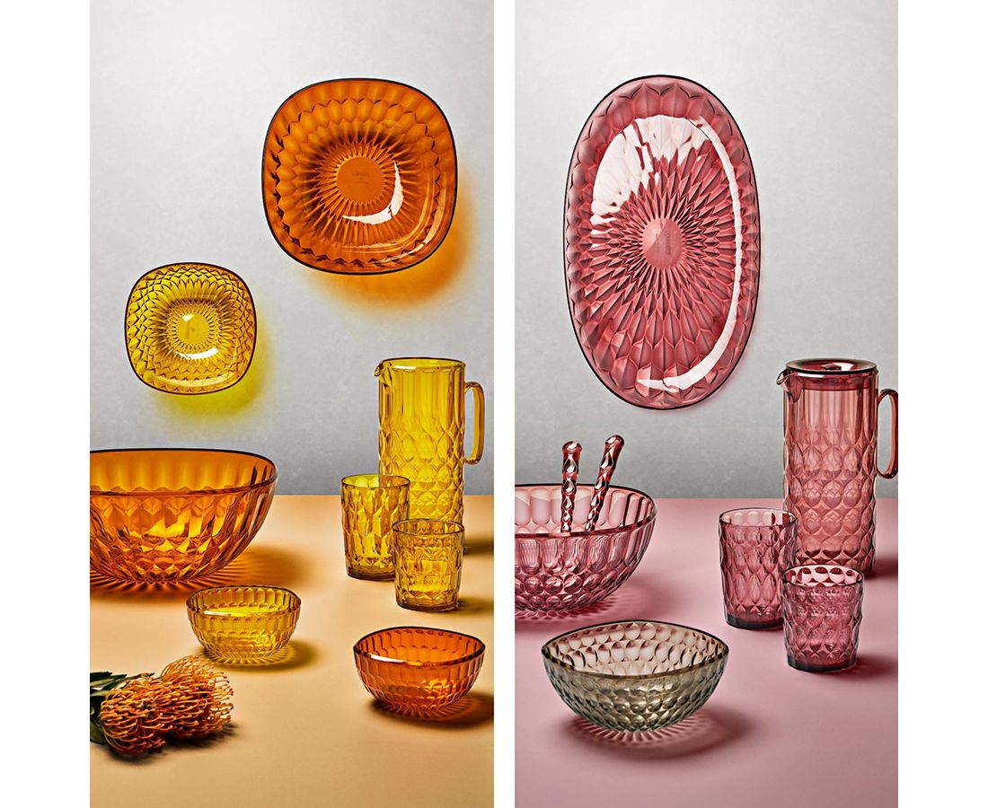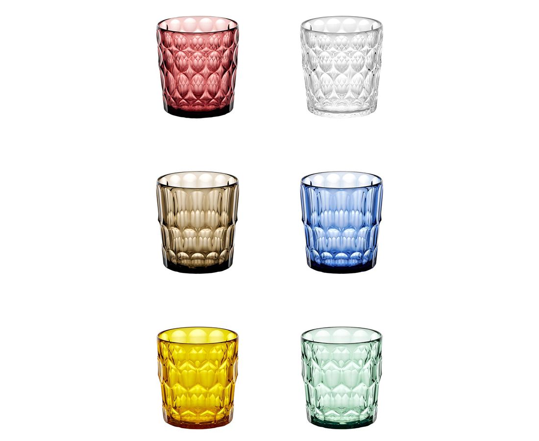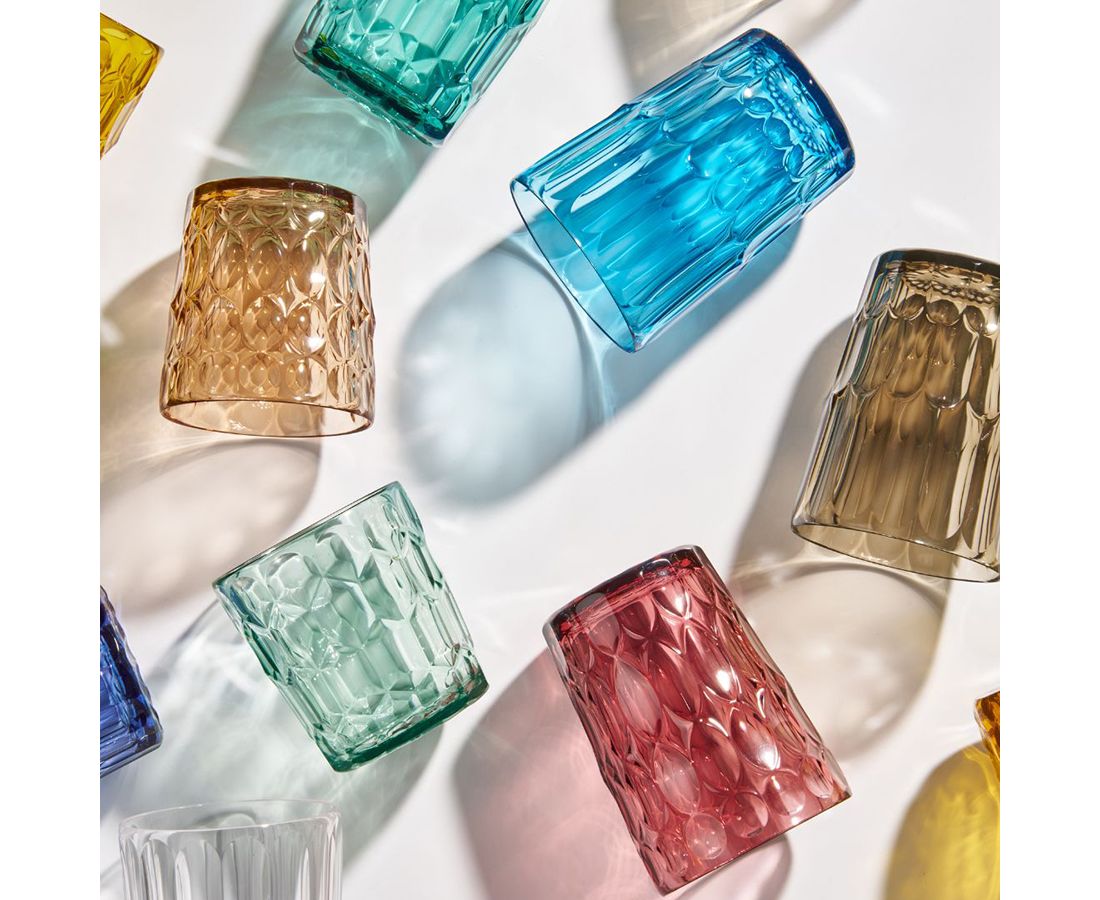 "Набор из шести стаканов Vanity от итальянского бренда Guzzini – необычная посуда, в которой гармонично сочетаются привлекательный дизайн и практичность. Благодаря высокой устойчивости современного органического материала к внешним воздействиям, она идеально подходит для сервировки как в помещении, так и на свежем воздухе. Инновационное акриловое стекло на биооснове получают из растительных отходов. За счет особенной рельефной поверхности и ярких цветов предметы изящно переливаются на свету, что делает их еще более привлекательными.
