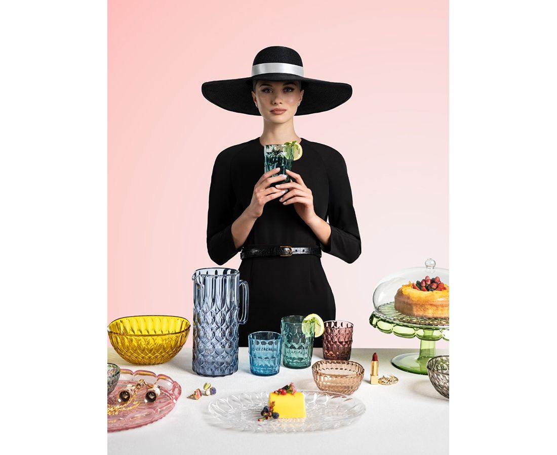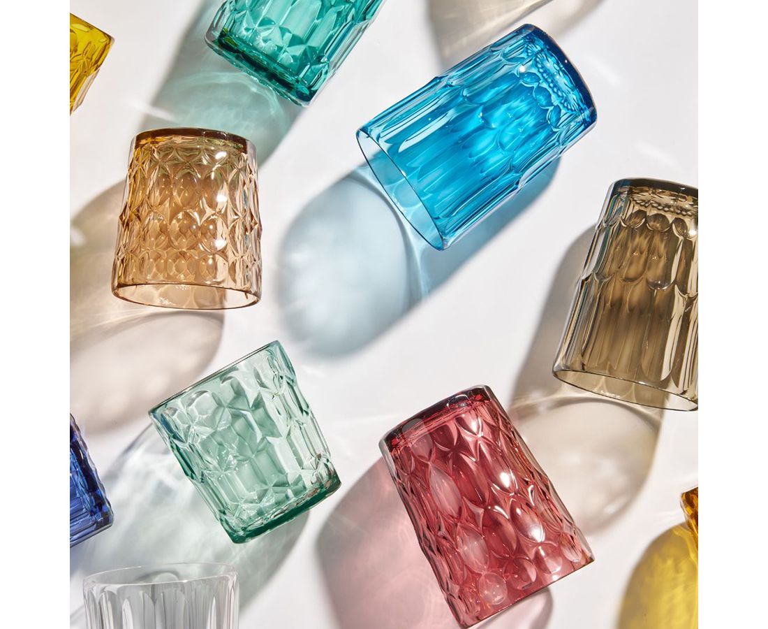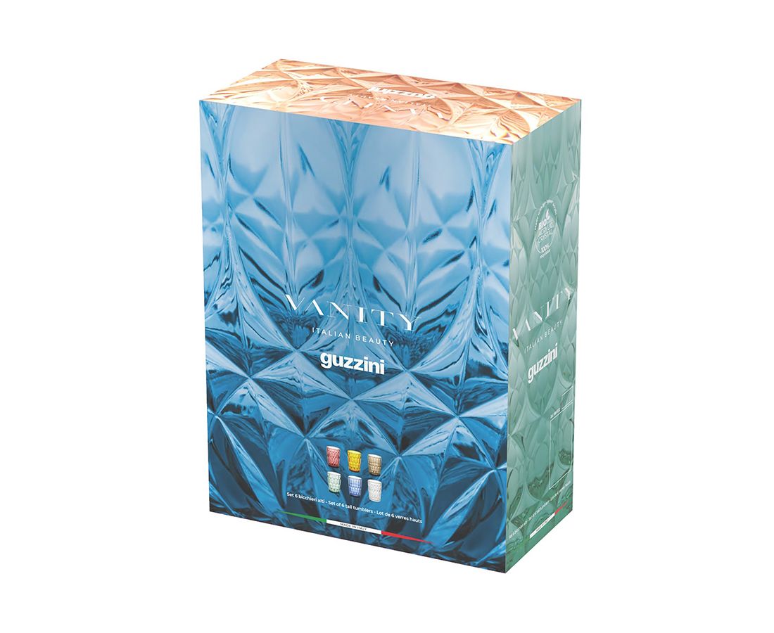 "Набор из шести стаканов Vanity от итальянского бренда Guzzini – необычная посуда из специального акрилового стекла, произведенного на биооснове из современного, органического сырья, которое получается из растительных отходов. Материал на 100%, подлежит вторичной переработке. За счет особенной рельефной поверхности и ярких цветов предметы изящно переливаются на свету, что делает их еще более привлекательными.